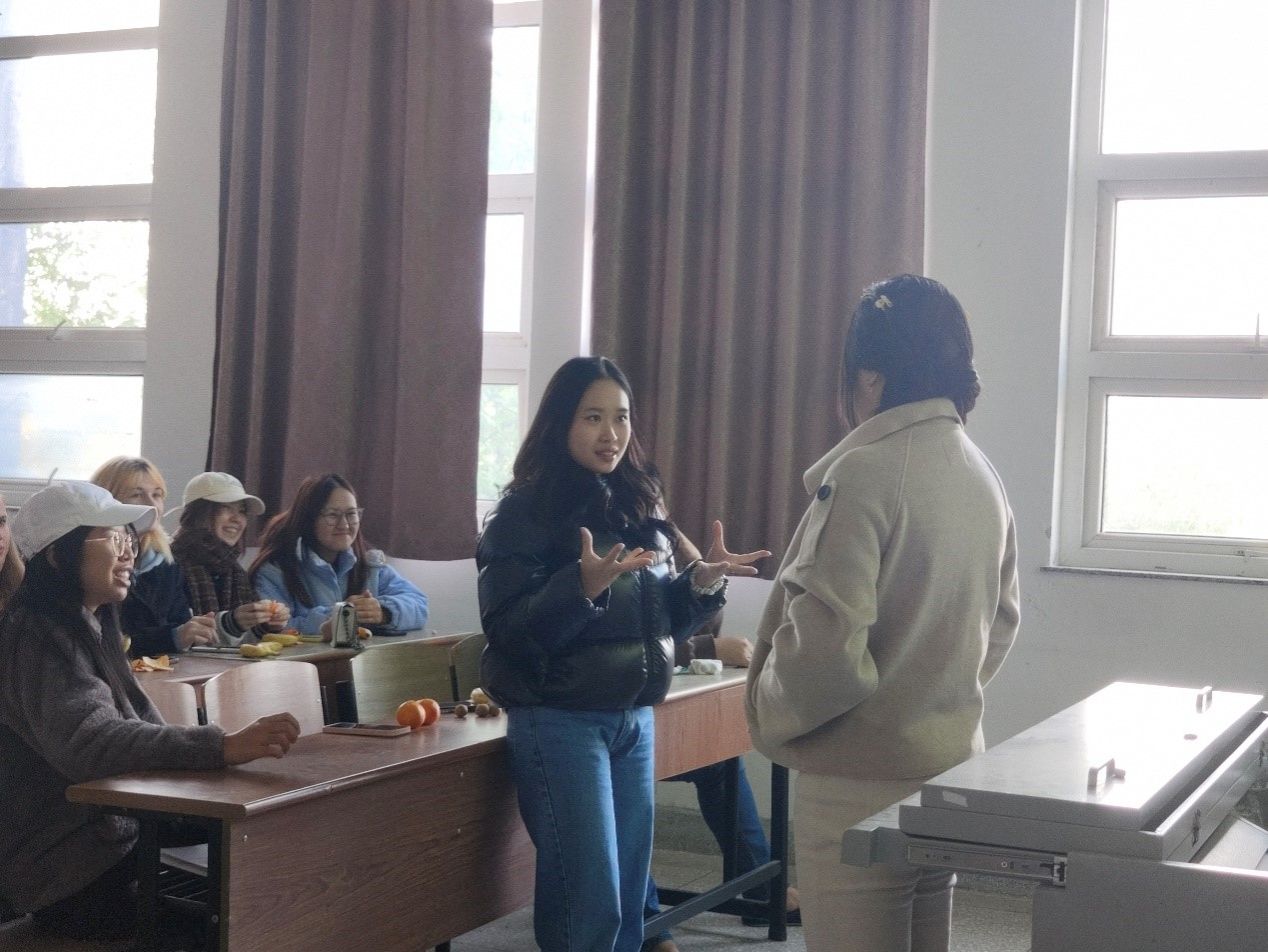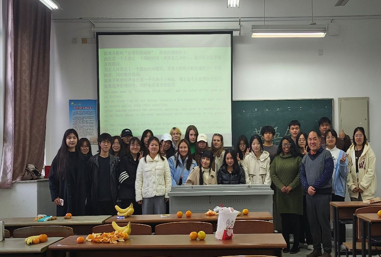 精心组织的活动现场,舒适欢乐的活动氛围,同学们的积极参与,大家纷纷分享自己独特的旅游经历。你来画我来猜,有趣的两人猜词游戏,引来了同学们的欢声笑语,最紧张刺激的当属“会爆炸的闹钟”,快速传递的闹钟点燃了整个活动的氛围。外教老师分享了自己在中国的各种有趣的经历还分别传授了中外同学学习外语的经验,俄罗斯留学生亚纳也分享了自己在我校学习的经历并且讲述了自己学习汉语的故事。