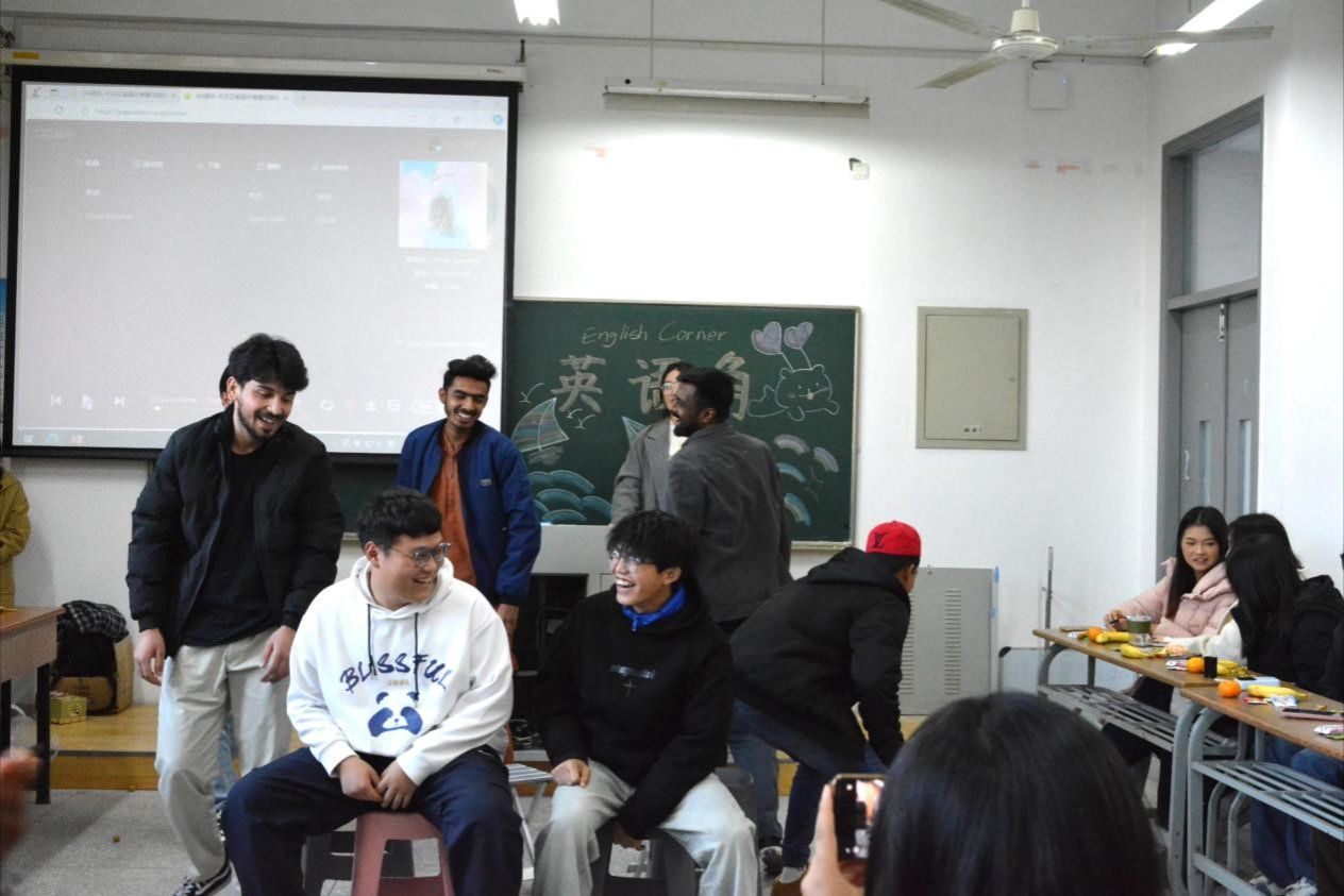 分享环节更是引人入胜。同学们积极用英语讲述自己在生活中遇到的礼仪场景,加深了外国友人对中国礼仪文化的了解。来自巴勒斯坦的海默同学展示了巴勒斯坦的见面礼节和传统服饰。同学们还踊跃提问,外教和留学生们耐心解答,形成了热烈而友好的交流氛围。大家不仅了解到了不同国家文化的差异,还深入挖掘了其中丰富的文化内涵。游戏环节将活动氛围推向高潮。参与者们积极参与“逛三园”、“抢椅子”等趣味游戏,展现了丰富的想象力和敏捷的思维能力,同时也收获了欢乐与挑战的乐趣。