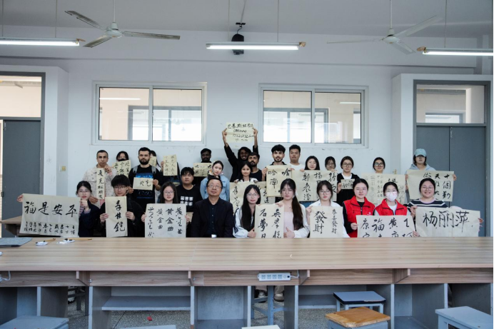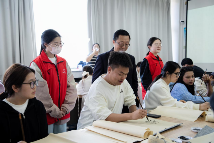 书法体验活动在氤氲墨香中徐徐展开。施江用熟练的英文引领留学生们走进书法艺术的殿堂,从甲骨文的古朴雄浑到行草的飘逸洒脱,系统阐释了中国书法三千年的文脉传承与审美流变。留学生们屏息凝神,沉醉于老师对“颜筋柳骨”、“二王风范”等经典书体的精妙解析。互动环节中,“为何毛笔被称为软笔却能力透纸背?”等充满哲思的提问此起彼伏,施老师引经据典的解答不时引发阵阵赞叹。实践环节将理论化为行动。施老师亲自示范“指实掌虚、腕平管直”的执笔要诀,其运笔时如行云流水般的韵律美感,令在场学生叹为观止。留学生们凝神静气,在纸上谨慎落笔,从最基本比划开始体会笔锋的提按顿挫。经过反复揣摩,当乌兹别克斯坦学生夏克松终于写出第一个端庄的“中国”字时,脸上绽放出欣喜的笑容。