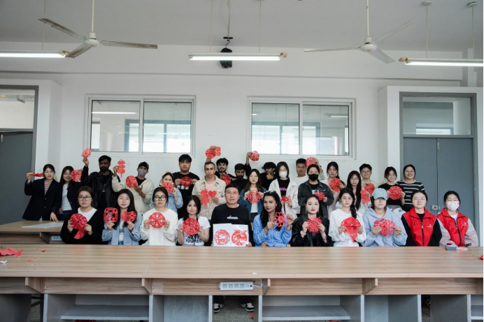 剪纸体验活动率先拉开帷幕。活动开始,钮纪抗通过展示不同剪纸作品向留学生们深入阐述了剪纸在中国民间文化里的重要地位及其独特的艺术魅力。当屏幕上出现大家熟悉的“盐立方”、“大铜马”等盐城地标建筑的剪纸作品时,现场不时响起“哇”的惊叹声。实践环节中,留学生们在钮老师的悉心指导下,纷纷拿起剪刀,尝试着剪出简单的图案。经过老师的指导,起初略显生涩的动作逐渐变得娴熟,原本歪歪扭扭的线条渐渐流畅起来,一张张红纸在他们手中魔术般变成对称的窗花、灵动的蝴蝶、可爱的熊猫等栩栩如生的作品。