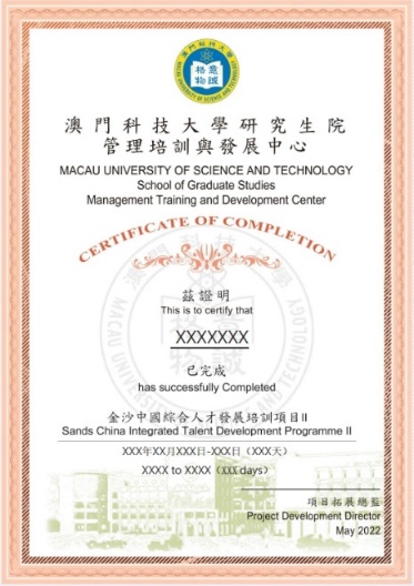 项目结束后,根据学员的出勤率、课堂表现和结业汇报的完成情况,澳门科技大学研究生院管理培训与发展中心(MTDC)将出具证书(体现总课时数)与成绩单(体现等级)。